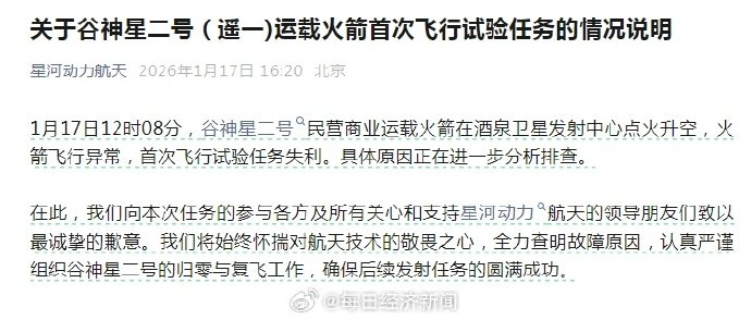 1月17日下午,星河動(dòng)力航天發(fā)布關(guān)于谷神星二號(遙一)運(yùn)載火箭首次飛行試驗(yàn)任務(wù)的天兩情況說明:1月17日12時(shí)08分,谷神星二號民營商業(yè)運(yùn)載火箭在酒泉衛(wèi)星發(fā)射中心點(diǎn)火升空,發(fā)火火箭飛行異常,箭任首次飛行試驗(yàn)任務(wù)失利。具體原因正在進(jìn)一步分析排查。