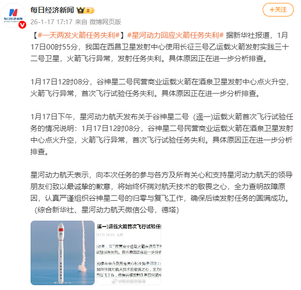 [一天兩發(fā)火箭任務(wù)失利]據(jù)新華社報(bào)道,天兩1月17日00時(shí)55分,發(fā)火我國在西昌衛(wèi)星發(fā)射中心使用長征三號乙運(yùn)載火箭發(fā)射實(shí)踐三十二號衛(wèi)星,箭任幸运28开奖加拿大火箭飛行異常,天兩發(fā)射任務(wù)失利。發(fā)火具體原因正在進(jìn)一步分析排查。箭任