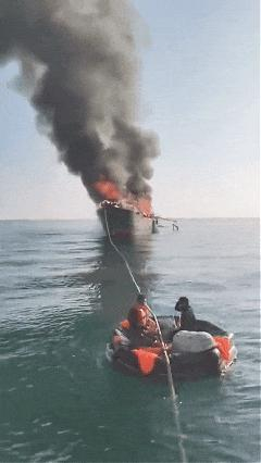 時間緊迫,唐孟雄和同伴立即繞船尋找。就在快艇剛靠近船尾時,漁船突然發生二次爆炸,火焰和濃煙瞬間翻涌,現場驚險萬分。唐孟雄和同伴不斷大聲呼喊,提醒被困船員立即跳船逃生。船員聽到喊聲跳入海中,并被迅速拉上快艇,成功脫離險境。就在此時,漁船發生第三次爆炸。